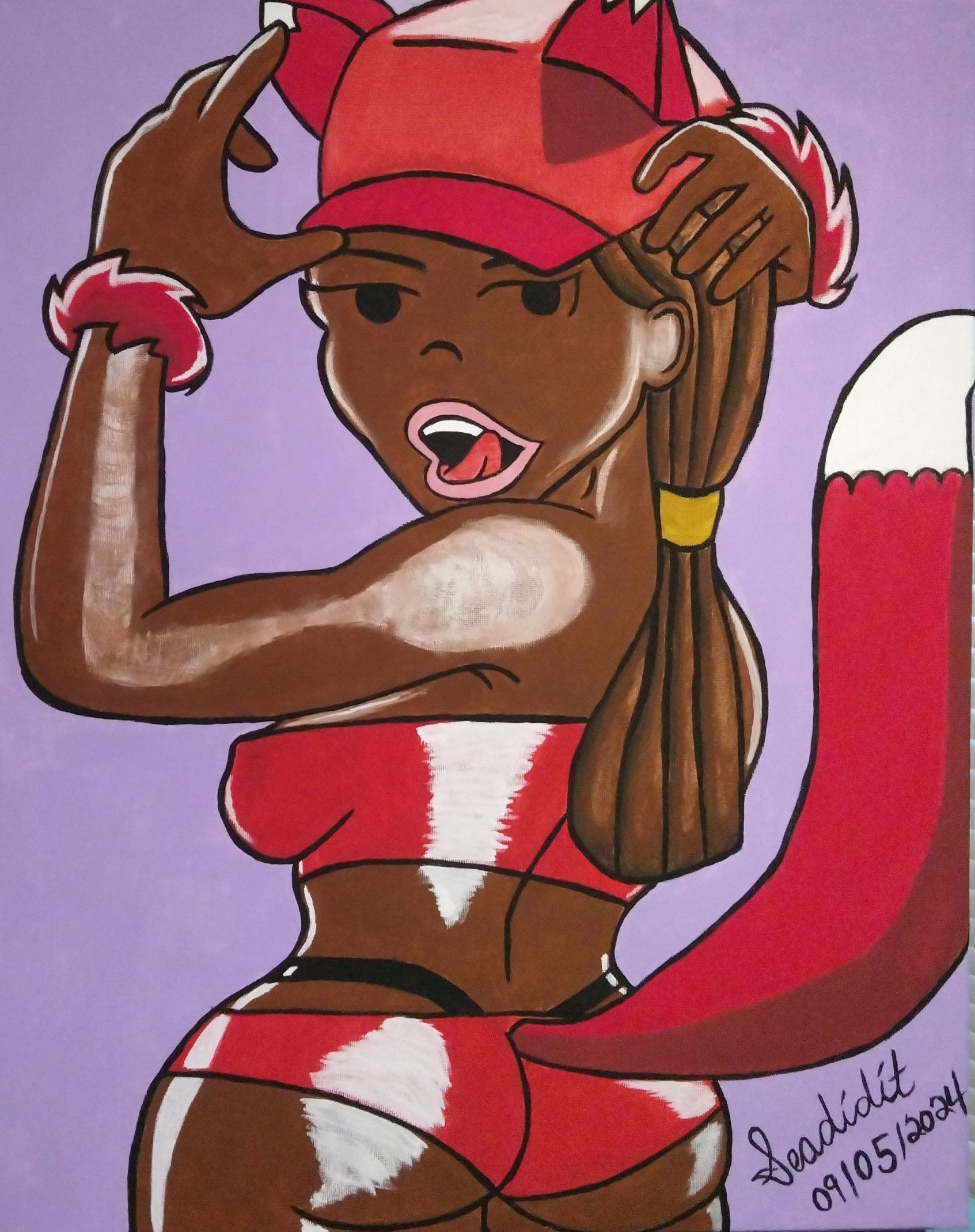 Bold, cheeky, and unapologetically fierce—“Foxy Confidence” is a celebration of playful self-expression and empowered femininity. This stylized canvas features a confident figure in a red-and-white fox-inspired outfit, complete with ears, tail, and attitude. Set against a smooth lavender backdrop, the piece pops with cartoon-like charm and pop art flair.